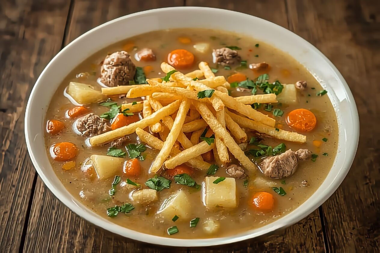 The Bolivian Sopa De Maní recipe is often served hot with a sprinkle of fresh parsley on top. French fries or sweet potato fries are added as a crunchy topping, which is a traditional finishing touch.