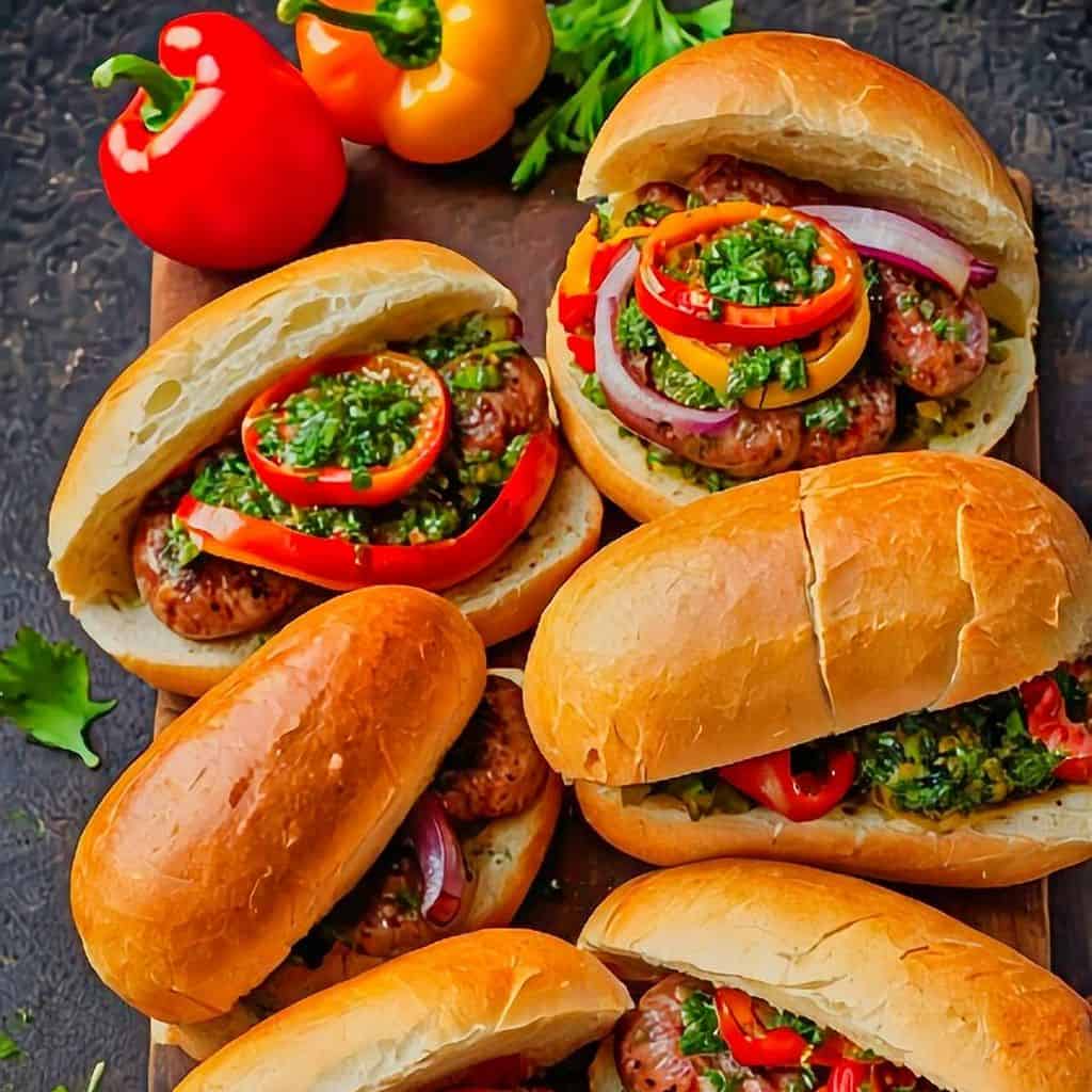 - To assemble the sandwiches, place a cooked sausage on each roll and top with a generous amount of chimichurri sauce. Add any optional toppings as desired.